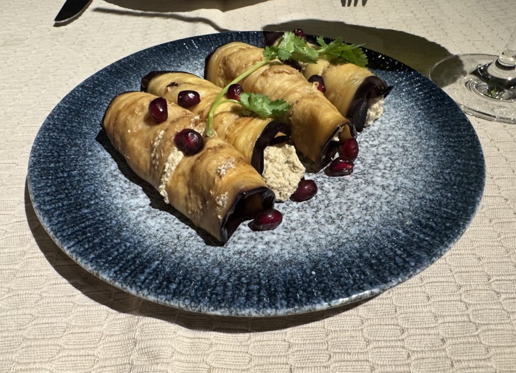 薄切りにしたナスを焼き、中にクルミをベースにした濃厚なペーストを詰めた冷菜。