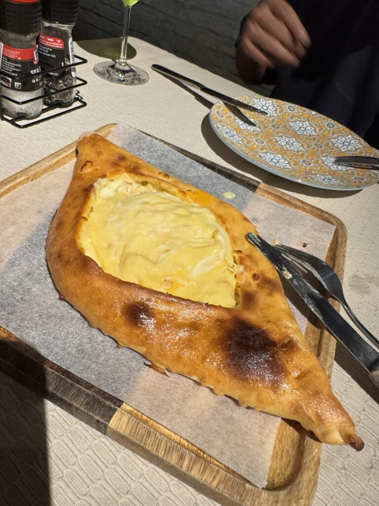 舟形のパン生地にチーズをたっぷり詰め、焼いた後、中央に生卵とバターを落としたジョージアのソウルフード。