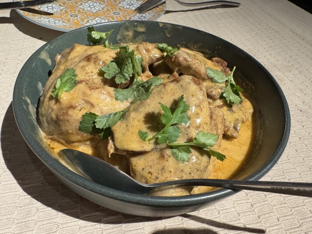 日本の牛丼チェーン「松屋」の期間限定メニューで知名度が上がった鶏肉をニンニクが効いたクリームソースで煮込んだジョージアの伝統料理。