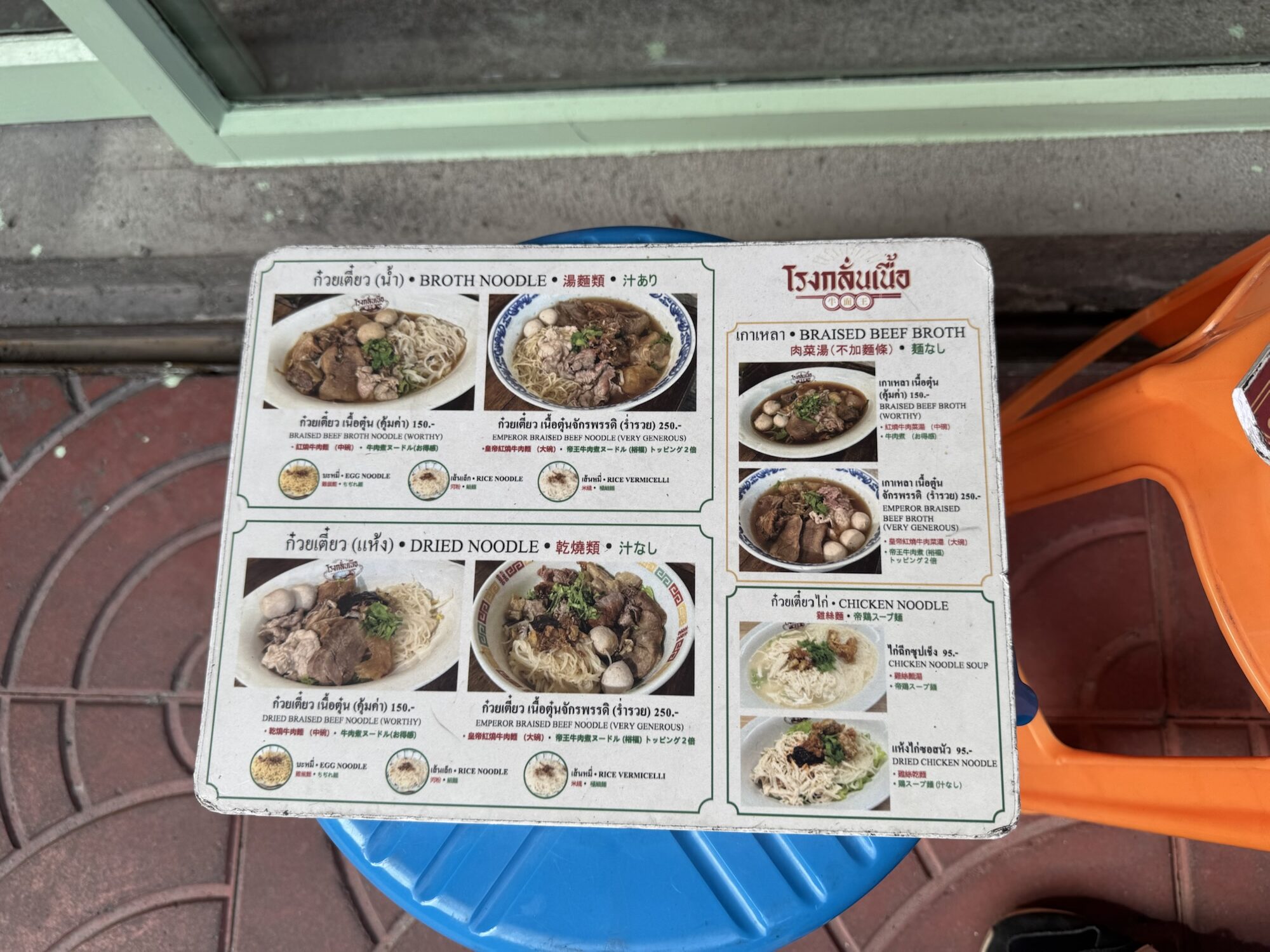 メインメニューは、じっくり煮込まれた牛肉を味わう**「牛肉麺(ビーフヌードル)」と、あっさり系の「鶏肉麺(チキンヌードル)」**の2種類。麺は米麺や卵麺など数種類から選べます。