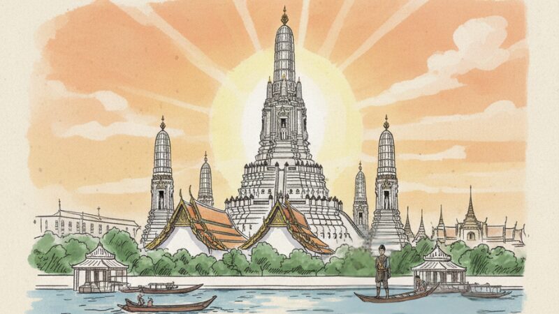 チャオプラヤ川にそびえ立つ大塔は、不屈の復興を象徴するバンコクのシンボルです。
